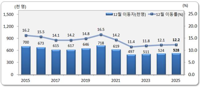 2025년 12월 국내 인구이동은 52만8천명으로 전년 동월보다 0.8% 증가했고, 시도간 이동이 늘면서 경기·충북은 순유입을 기록한 반면 서울은 -4,887명 순유출로 감소 폭이 커졌다.전국 12월 인구이동 통계에 따르면 이달 이동자 수는 52만8천명으로 전년 동월(52만4천명) 대비 4천명 늘었다. 인구이동률(인구 100명당 이동자