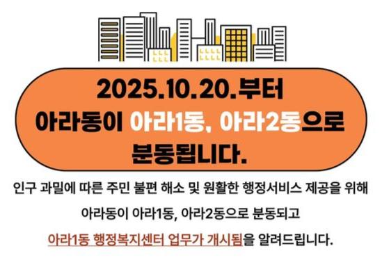 서구는 2025년 2∼3월 아라동 주민을 대상으로 추진한 분동 경계와 명칭에 대한 의견 수렴 결과를 반영해 원당대로를 기준으로 남측은 아라1동, 북측은 아라2동으로 구분하는 분동 계획을 2025년 5월 확정했다.