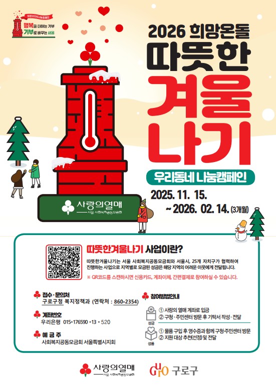 2026 희망온돌 따뜻한 겨울나기 홍보물.서울 구로구(구청장 장인홍)는 11월 15일부터 내년 2월 14일까지 ‘2026 희망온돌 따뜻한 겨울나기’ 사업을 추진한다고 밝혔다.