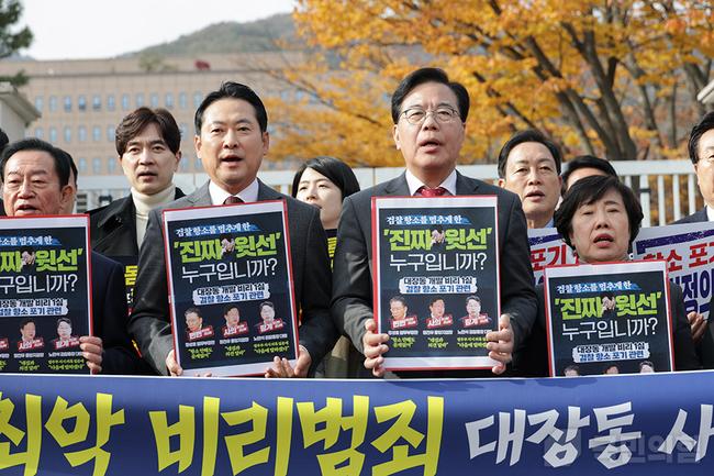 국민의힘은 11일 서울 서초구 대검찰청과 경기 과천시 법무부 청사 앞에서 장동혁 당 대표, 송언석 원내대표 등 소속 의원들이 참석한 가운데 검찰의 대장동 사건 항소 포기와 관련한 외압 의혹을 제기하며 정성호 법무부 장관의 사퇴와 국정조사·특검을 요구하는 규탄대회를 열었다.
