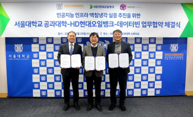 서울대학교 공과대학은 26일 관악캠퍼스에서 HD현대오일뱅크 및 액침냉각 시스템 운영업체 데이터빈과 함께 ‘인공지능 인프라 액침냉각 실증 프로젝트’ 양해각서(MOU)를 체결했다. 왼쪽부터 HD현대오일뱅크 윤활유사업본부장 정태오 전무, 서울대학교 공과대학 김영오 학장, 데이터빈 김수용 대표