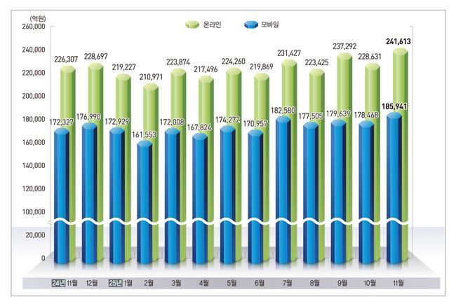 2025년 11월 국내 온라인쇼핑 거래액이 24조1,613억 원으로 전년 동월 대비 6.8% 증가한 가운데, 음식서비스와 음·식료품, 여행·교통 서비스가 성장세를 주도하며 모바일 중심의 소비 확대 흐름이 이어진 것으로 나타났다.