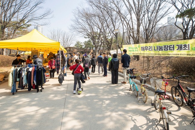 '해우리 나눔장터'는 가정에서 사용하지 않는 의류, 도서, 완구 등 중고 물품을 구민이 직접 판매·교환하며 자원 재사용을 실천하는 주민 참여형 장터로, 중고 물품을 판매하기 위해서는 사전 신청을 통해 자리를 배정받아야 한다.