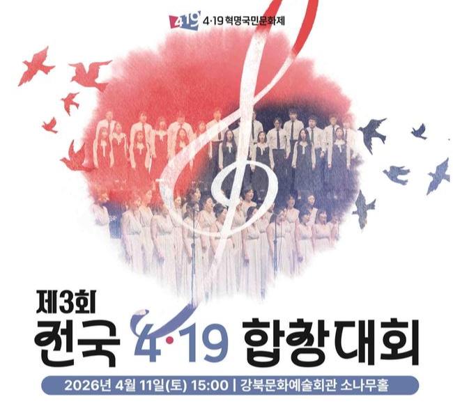 서울 강북구(구청장 이순희)가 오는 4월 11일(토) 오후 3시 강북문화예술회관 소나무홀에서 ‘제3회 전국 4·19 합창대회’를 개최한다.
