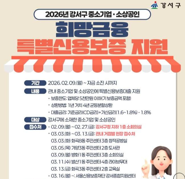 신청은 3월 3일부터 자금 소진 시까지 서울신용보증재단 강서종합지원센터(공항대로 236, 6층)에서 현장 접수로 진행된다.