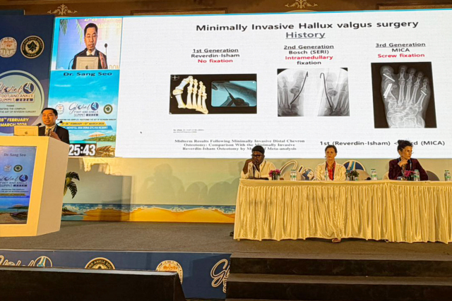 학회 마지막 날인 3월 1일에는 ‘최소 침습 무지외반증 수술 - 합병증 및 교정 전략(MIS Hallux Valgus-Complications&Corrective Strategies)’ 세션의 케이스 리드(Case Lead)를 맡았다. 서상교 대표원장은 약 40분간 최소 침습 무지외반증 수술의 복잡한 사례를 바탕으로 한 술기 핵심 전략을 제시하며 참석 의료진들의 논의를 이끌었다.