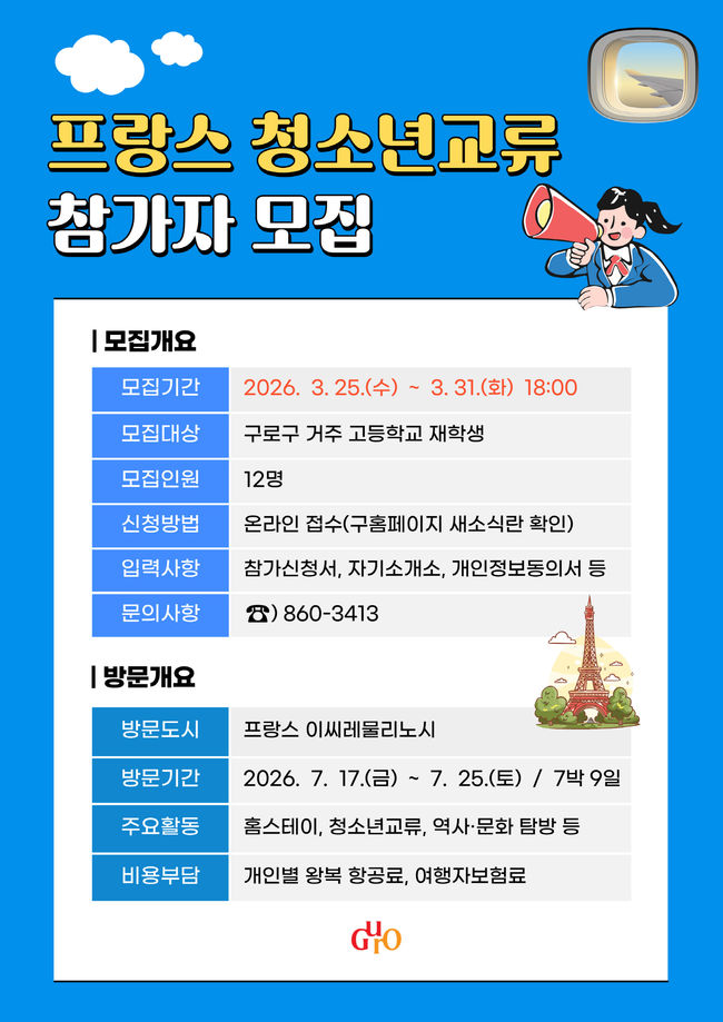 프랑스 청소년교류 참가자 모집 안내 포스터.구로구는 오는 25일부터 31일까지 ‘프랑스 청소년 교류 프로그램’ 참여자를 모집한다. 이 프로그램은 관내 청소년에게 해외 역사와 문화 체험 기회를 제공하기 위해 마련됐다. 국제 교류 경험을 통해 글로벌 역량을 높이기 위한 취지다.