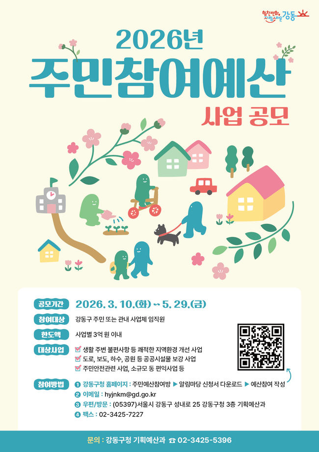 2026 강동구 주민참여예산 사업공모 포스터.강동구는 주민참여예산제 운영을 통해 주민 제안사업 공모를 실시한다고 10일 밝혔다. 주민이 예산 편성 과정에 참여해 직접 사업을 제안하고 심의에 참여할 수 있는 제도다.