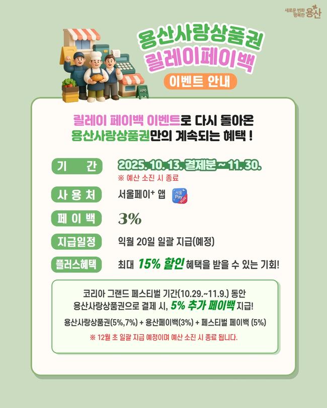 앞서 지난 9월 16일 총 110억 원 규모로 발행된 '추석맞이 용산사랑상품권'은 7% 할인과 3% 페이백 혜택에 힘입어 단기간에 완판됐다. 이번 릴레이 페이백 행사 역시 결제 금액의 3%를 돌려주는 혜택을 제공하며, 할인율 5% 또는 7%가 적용된 모든 (신)용산사랑상품권 구매자에게 동일하게 적용된다. 이에 따라 소비자는 최소 8%에서 최대 10%까지의 실질 할인 효과를 누릴 수 있다.