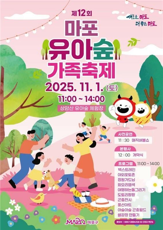마포구(구청장 박강수)는 아이들과 가족이 함께 도심 속에서 자연을 즐길 수 있는 '제12회 유아숲 가족축제'를 오는 11월 1일(토) 상암근린공원 내 유아숲체험원에서 개최한다.