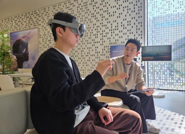 삼성스토어 홍대에서 헤드셋 형태의 모바일 기기 ‘갤럭시 XR’을 체험하는 모습