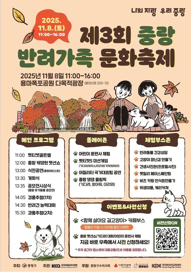 중랑구, 반려인·비반려인 함께 즐기는 ‘제3회 중랑 반려가족 문화축제’ 개최 홍보 포스터.서울 중랑구(구청장 류경기)는 오는 11월 8일 토요일 오전 11시부터 용마폭포공원 다목적 광장에서 ‘제3회 중랑 반려가족 문화축제’를 개최한다고 밝혔다.