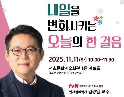 11일 오전 10시에는 서초문화예술회관 아트홀에서 명사 특강이 열린다. 인지심리학자 김경일 교수가 '내일을 바꾸는 오늘의 한걸음'이라는 주제로 인생 후반기의 행복은 멀리 있는 미래가 아니라 오늘 내딛는 작은 한걸음에서 시작된다는 의미를 전한다. 퇴직과 경력 단절로 힘들어하는 50+세대에게 멈추지 않고 다시 시작할 수 있는 용기를 북돋울 예정이다.