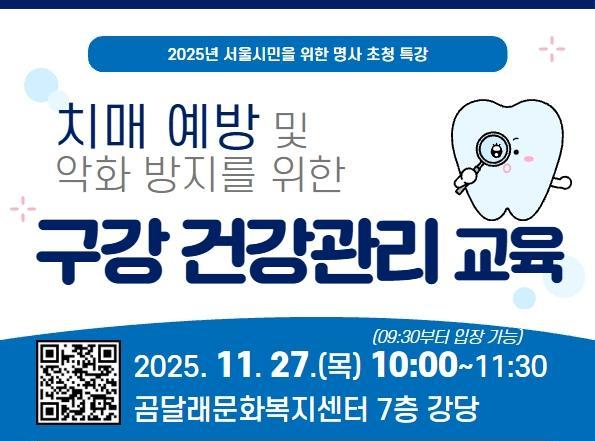 이번 신규 지정을 기념해, 구는 오는 27일(목) 오전 10시 곰달래문화복지센터(강서로5길 50)에서 지역주민 120여 명을 대상으로 '치매 예방을 위한 올바른 구강관리' 특강을 개최한다.