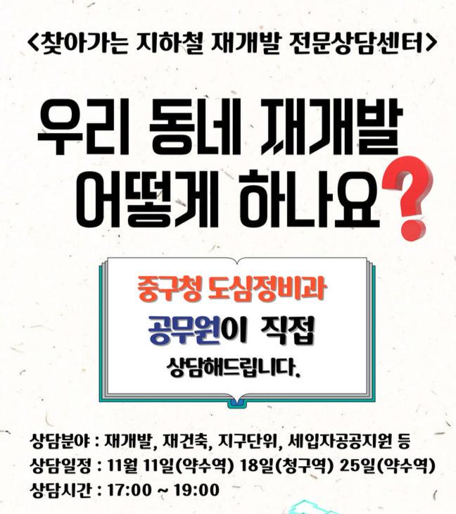 중구가 주민들이 일상 속에서 재개발 관련 궁금증을 손쉽게 해결할 수 있도록 지하철역 맞춤 상담을 운영한다.