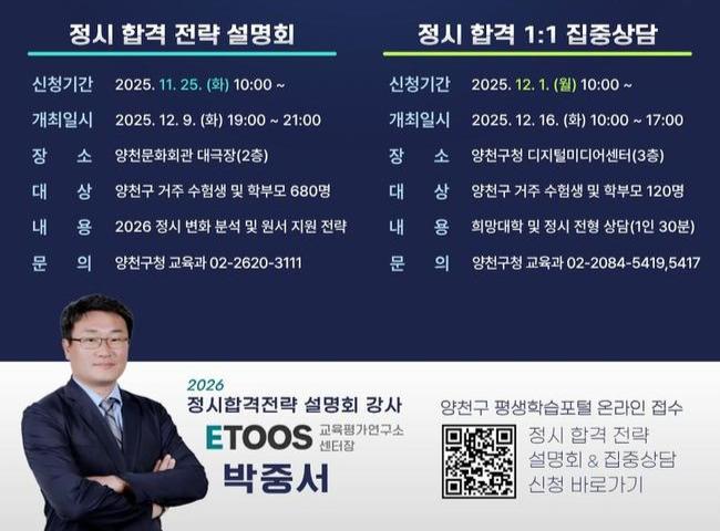 '2026학년도 대입 정시 합격 전략 설명회'는 12월 9일 오후 7시, 양천문화회관 대극장에서 열린다. 이투스 교육평가연구소 박중서 센터장이 강사로 나서 ▲정시모집 요강 분석 ▲대학별 수능 점수 환산방법 ▲주요 대학 지원 전략 ▲합격 사례 분석 결과 등 합격 비법을 상세히 알려줄 예정이다.