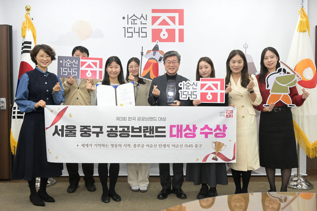 중구 공공브랜드 대상 수상 기념 사진.서울 중구(구청장 김길성)는 2일 도시브랜드 ‘이순신1545’가 ‘제3회 한국 공공브랜드 대상’ 브랜드 커뮤니케이션 부문에서 대상을 수상했다고 밝혔다.