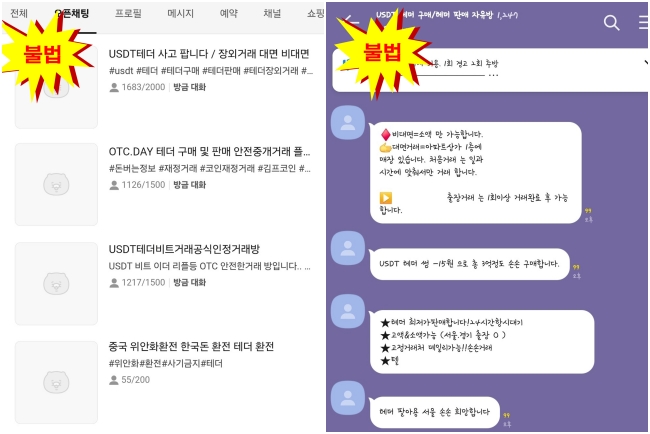주요 불법 가상자산 취급업자 유형 : 텔레그램, 오픈채팅방을 통해 익명으로 스테이블 코인을 교환