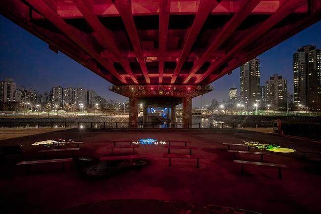 하부구간에는 7가지 색깔로 무지개를 연상시키는 레인보우 연출과 파노라마 형태의 다양한 패턴이 구현되도록 프로그래밍 된 ㄱ자형 LED 디자인 폴을 설치해 생동감을 불어넣었다.