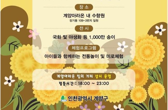 인천광역시 계양구(구청장 윤환)는 인천9경 계양아라온에서 오는 9월 20일부터 10월 31일까지 '가을꽃 국화축제'를 개최한다고 밝혔다.