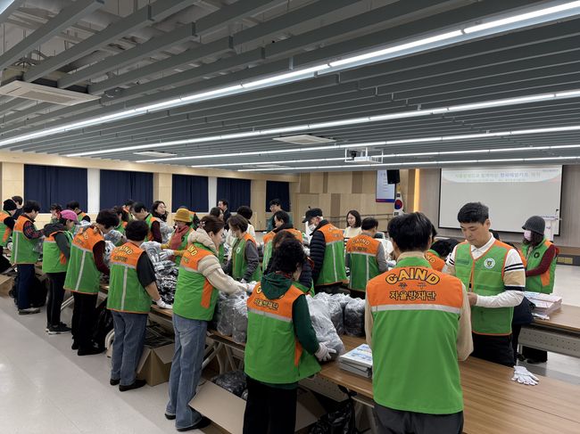 예방키트를 제작하는 중구지역자율방재단원들.서울 중구는 지난 11일 중구청 중구홀에서 중구지역자율방재단원 30명과 함께 한파피해 예방키트 820개를 제작했다고 16일 밝혔다. 완성된 키트는 한파 취약계층과 1대1로 매칭된 전담 공무원을 통해 각 가정에 전달됐다.