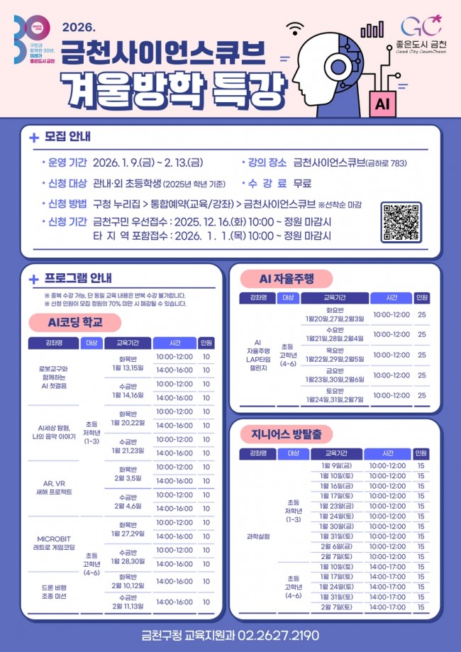 모든 프로그램은 무료로 운영된다. 금천구 초등학생은 12월 16일 오전 10시부터 홍보물의 정보무늬(QR코드) 또는 금천구청 누리집 '통합예약'-'교육/강좌'-'금천사이언스큐브'에서 선착순으로 신청할 수 있다. 자세한 일정은 신청 화면과 홍보물에서 확인하면 된다.