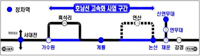 국토교통부는 24일 호남선 가수원역~논산역 구간을 직선화하고 훈련소 앞에 ‘신연무대역’을 신설하는 철도 고속화 사업 기본계획을 확정·고시해, 앞으로 논산 육군훈련소까지 KTX로 한 번에 이동할 수 있게 된다고 밝혔다.