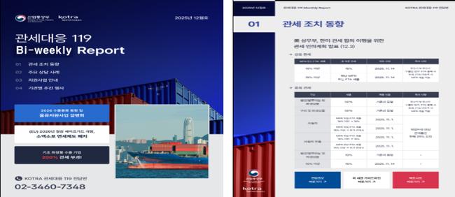 아울러 범정부 관세애로 통합상담 창구인 ‘관세대응119’의 11개 협력기관과 함께 ‘관세대응119 리포트’를 격주로 발간한다. 리포트에는 글로벌 보호무역조치 동향과 범정부 주요 지원사업, 기업 대응 사례와 전문가 칼럼 등이 담긴다. 협력기관에는 코트라를 비롯해 무역협회, 대한상의, 중소벤처기업진흥공단, aT 등이 참여한다.