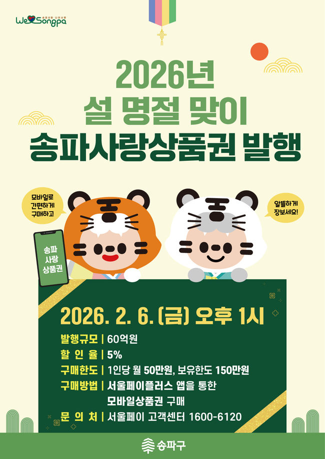 설 맞이 '송파사랑상품권' 발행 안내 포스터.송파구는 설 명절 성수기를 맞아 지역 소비를 촉진하기 위해 ‘송파사랑상품권’과 ‘송파땡겨요상품권’을 발행한다고 3일 밝혔다. 구는 명절 물가 상승에 따른 구민 부담을 완화하고 전통시장과 골목상권을 중심으로 소비를 유도하기 위해 이번 상품권 발행을 추진했다.