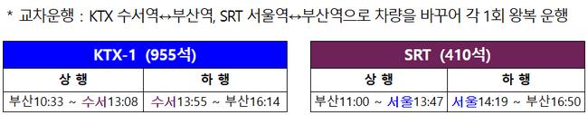 운행 시간은 기존과 동일하게 유지된다. KTX는 부산역 10시33분 출발해 수서역 13시08분 도착, 수서역 13시55분 출발해 부산역 16시14분 도착한다. SRT는 부산역 11시 출발해 서울역 13시47분 도착, 서울역 14시19분 출발해 부산역 16시50분 도착 일정이다.