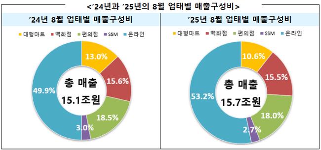 업태별 매출 비중을 보면 온라인이 53.2%를 기록하며 처음으로 8월 기준 과반을 차지했고, 오프라인은 46.8%로 축소됐다. 오프라인 점포 수는 대형마트(-1.1%), 백화점(-3.4%), 편의점(-1.6%)이 줄었으나 준대규모점포(2.0%)는 소폭 늘었다.