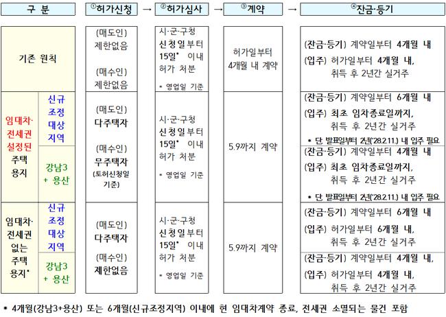 토지거래허가구역 내 조정대상지역별 취득 및 입주 구분