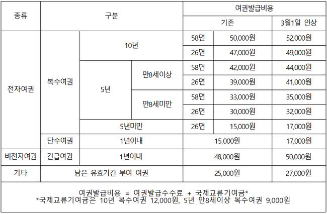 여권발급수수료 인상 전후 비교표