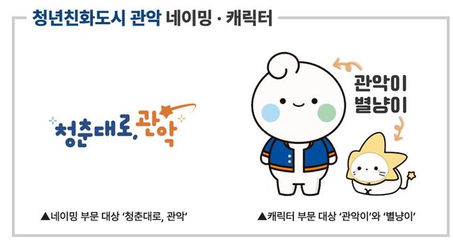 네이밍 대상은 ‘청춘대로, 관악’으로, ‘청년이 하고 싶은 대로 할 수 있게 존중·지지한다’는 뜻과 ‘청년의 도전을 성공으로 이끄는 큰 길(大路)’이라는 중의적 의미를 담았다. 캐릭터 대상은 관악산 구름을 닮은 청년 ‘관악이’와 낙성대에 불시착한 외계 고양이 ‘별냥이’가 함께 구 전역을 여행하며 추억을 쌓는 이야기를 담았다.