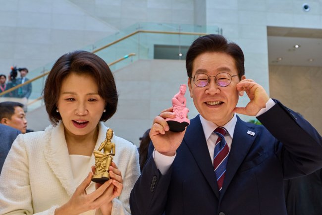 이재명 대통령과 김혜경 여사가 26일 서울 용산구 국립중앙박물관에서 열린 특별전 ‘우리들의 이순신’을 관람한 뒤 상품관에서 기념품과 함께 기념촬영을 하고 있다. (사진=청와대)