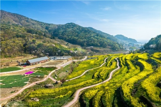 '파라다랑스'는 '파라다이스'와 '다랑이 논'의 합성어로, 남해의 전통 다랑이 논 경관을 살려 조성된 감성형 테마공원이다. 지난해 봄 첫 개장 이후 두 번째 봄을 맞이한 올해, 공원 일대에서는 유채꽃이 서서히 개화를 시작하며 방문객들에게 봄 분위기를 전하고 있다.