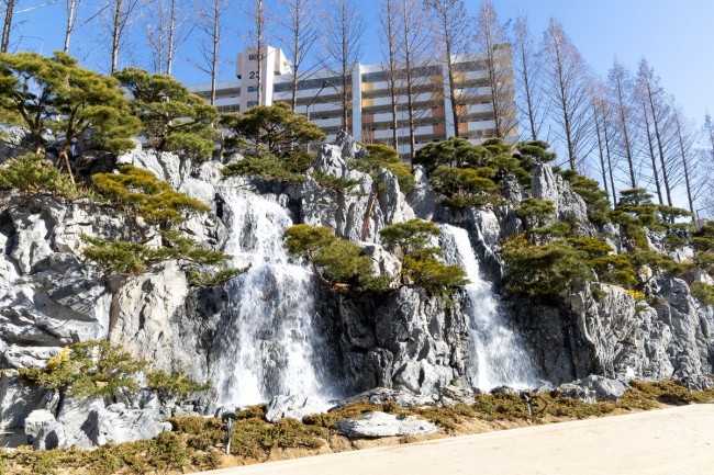 폭포 외관에는 전국 각지에서 엄선한 자연석(기암괴석)을 활용하고, 소나무와 계절별 야생화를 조화롭게 배치해 깊은 산세의 정취와 자연의 아름다움을 한층 돋보이게 했다.