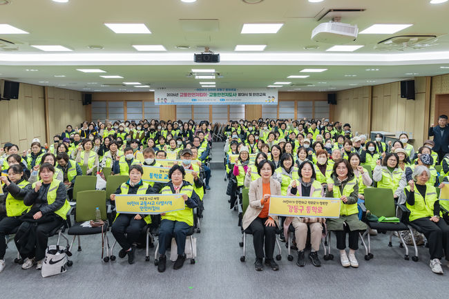 2026년 교통안전지킴이·교통안전지도사 발대식 및 안전교육 행사 사진.강동구(구청장 이수희)는 지난 19일 구청 대강당에서 교통안전지킴이와 교통안전지도사 200여 명이 참석한 가운데 발대식을 열었다고 24일 밝혔다. 참석자들은 어린이 교통사고 예방을 위한 '안전지킴이 선서'를 함께 낭독하며 활동 의지를 다졌다.