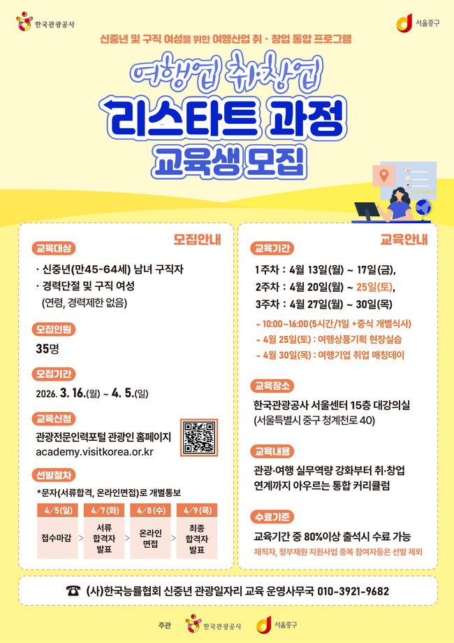 중구는 한국관광공사와 함께 '여행업 취·창업 리스타트 과정'을 4월 13일부터 운영한다. 대상은 만 45세에서 64세 이하 신중년과 나이 제한 없는 구직 여성으로, 40명을 모집한다. 신청은 4월 5일까지다.