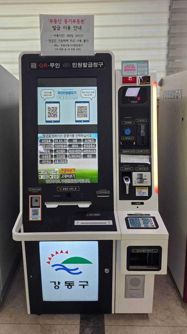 강동구청 민원실 내 무인민원발급기.강동구(구청장 이수희)는 지난 1일부터 관내 35대 모든 무인민원발급기에 'QR코드 모바일 가이드'를 적용했다고 6일 밝혔다.