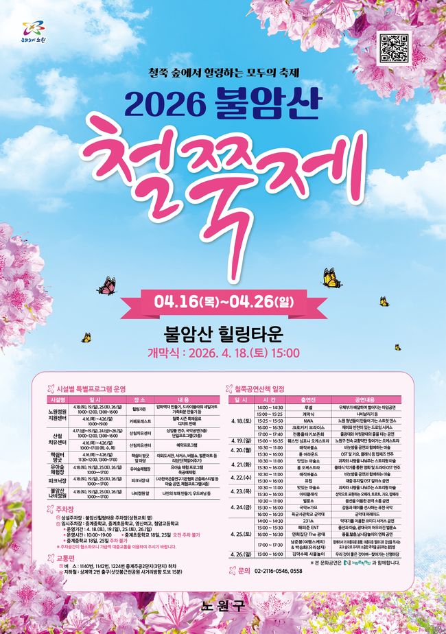 불암산철쭉제포스터.노원구(구청장 오승록)는 오는 16일(목)부터 26일(일)까지 불암산 힐링타운 일원에서 '2026 불암산 힐링타운 철쭉제'를 개최한다.
