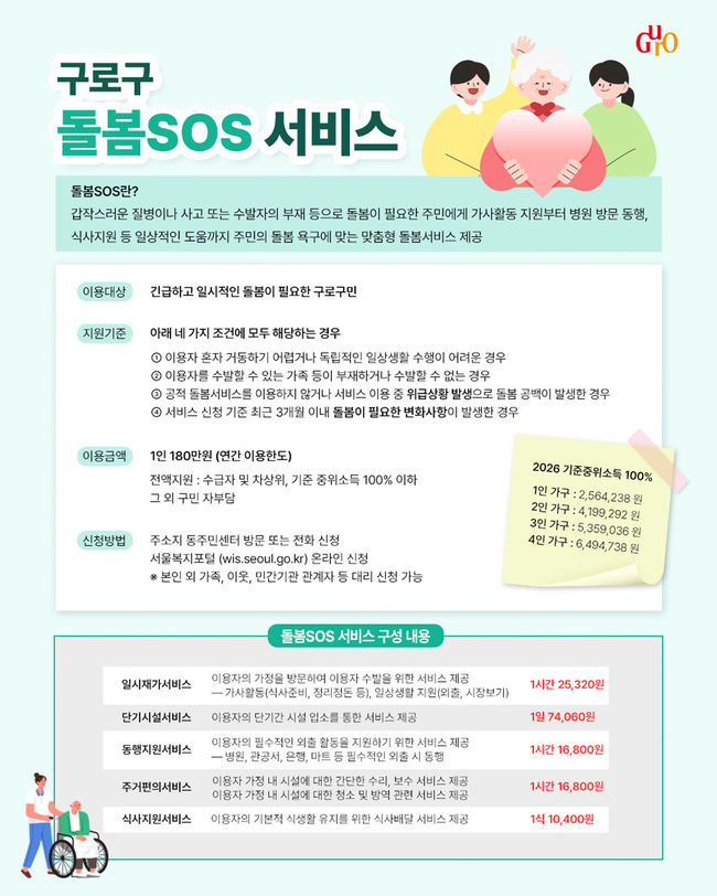 서비스 이용 한도는 1인당 연간 최대 180만 원이며, 재료비 20만 원·교통비 15만 원이 별도로 지원된다. 기초생활수급자·차상위계층·기준 중위소득 100% 이하 가구는 5대 돌봄서비스를 무료로 받을 수 있고, 그 외 주민은 비용을 전액 부담한다. 신청은 주소지 동주민센터에서 가능하며, 문의는 구로구청 통합돌봄과(02-860-5438)로 하면 된다.