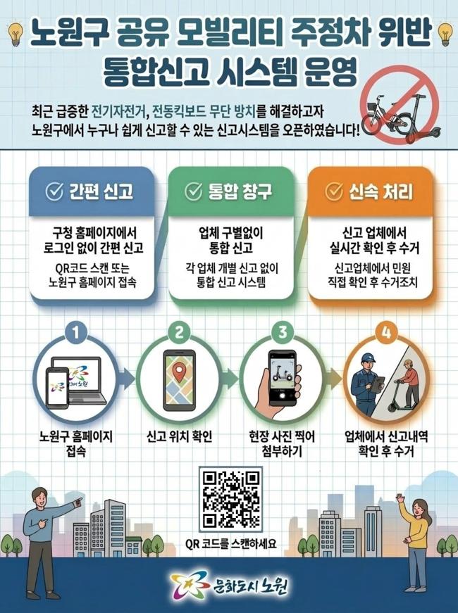 오승록 노원구청장은 "이번 통합 신고시스템 구축은 무단 방치된 공유 모빌리티로 인한 주민 불편을 최소화하기 위한 선제적 조치"라며 "앞으로도 쾌적한 도시 미관을 조성하고, 구민 누구나 안심하고 걸을 수 있는 안전한 보행환경을 만드는 데 최선을 다하겠다"고 말했다.
