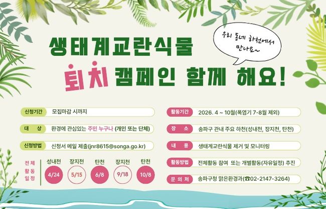 서울 송파구가 4월 24일부터 10월까지 성내천·장지천·탄천 일대에서 '생태계교란식물 퇴치 캠페인'을 진행한다.