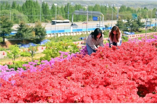 약 1만 1천㎡ 부지를 가득 채운 영산홍은 잎보다 꽃이 먼저 피어나는 특성 덕에 빈틈없는 붉은 빛을 선사한다. 꽃길 어디서든 카메라만 대면 '인생 사진'을 건질 수 있다는 입소문이 퍼지면서 인스타그램과 블로그 등 사회관계망서비스(SNS)에서도 반응이 뜨겁다.