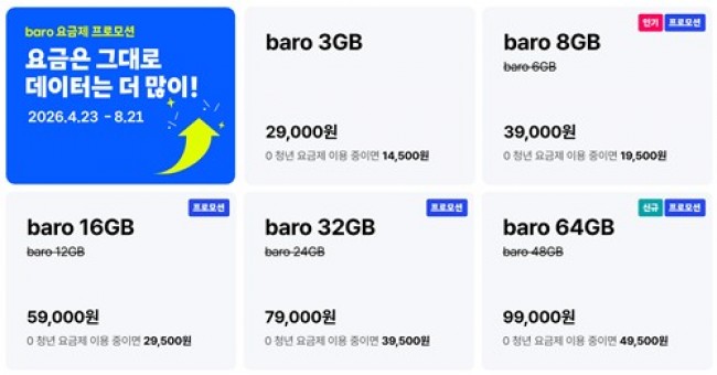 오늘(23일)부터 오는 8월 21일까지 진행되는 이번 프로모션에서는, 바로(baro) 요금제 가입 시 동일 요금으로 최대 16GB의 데이터를 추가 제공한다.