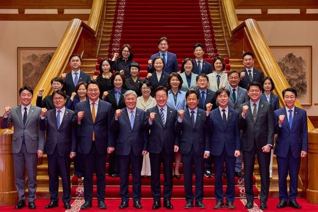 이재명 대통령이 29일 청와대에서 열린 비교섭단체 및 무소속 국회의원 초청 오찬 간담회에 앞서 참석자들과 기념촬영을 하고 있다.