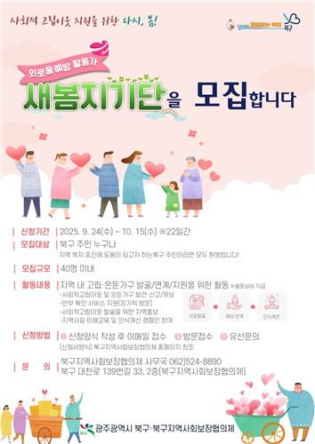 광주시 북구(구청장 문인)가 사회적으로 고립된 이웃들이 지역사회의 구성원으로서 돌아올 수 있도록 지원하는 '새봄지기단'에 참여할 주민을 오는 15일까지 모집한다고 9일 밝혔다.